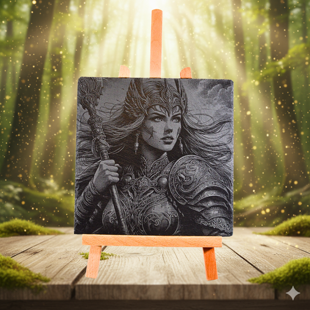 Ardoise gravée et vernie de 25x25 cm, fournie avec son support imprimé en 3D à base d’amidon de maïs.