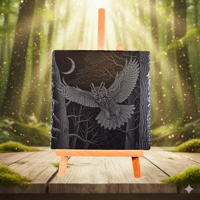 Ardoise gravée et vernie de 25x25 cm, fournie avec son support imprimé en 3D à base d’amidon de maïs.